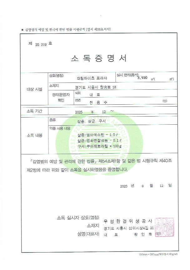 감염 예방 및 요양원 시설 위생 관리를 위하여 정기적으로 하고 있는 요양원 전체 소독 사진 및 소독증명서(8월 분)를 첨부하여 알려드립니다. |